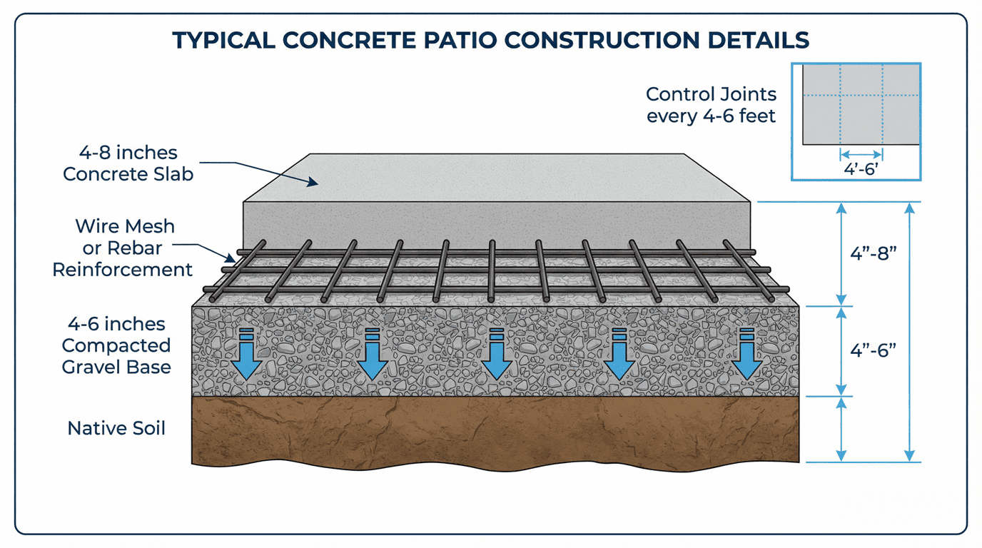 Local contractors also account for regional factors like frost depth, soil stability, and drainage when determining patio thickness. While 4 inches meets baseline requirements, proper gravel base depth and reinforcement play a major role in meeting local building standards and preventing premature cracking.